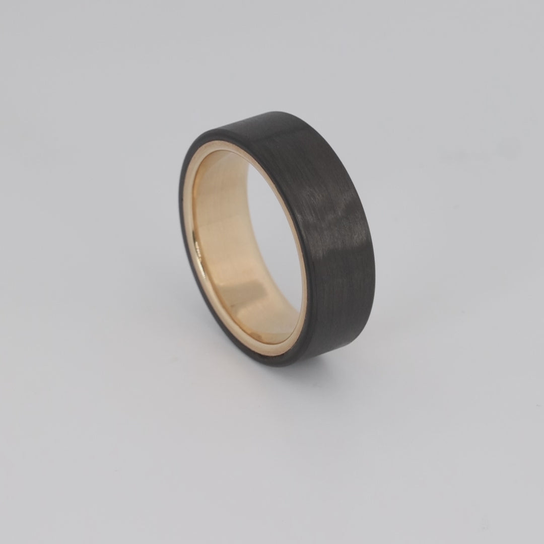 This men's gold wedding ring with carbon fiber displays you as the fearless warrior you are—a golden god. Cut from the finest cloth and ready to take on the world. Let The Knight guide you on your quest for Excalibur. Or like, a cheeseburger with onion rings.