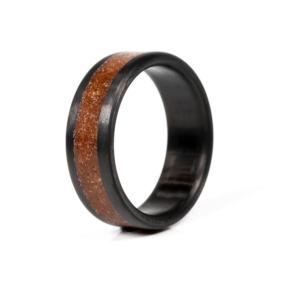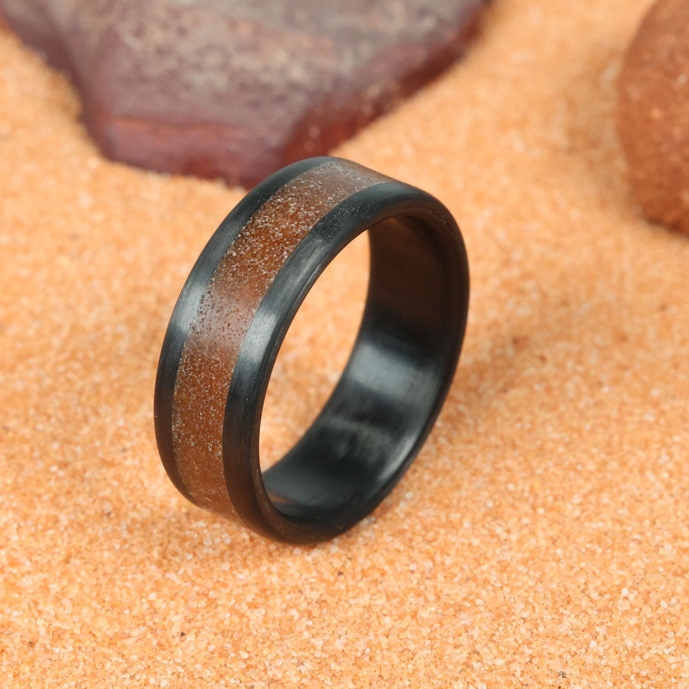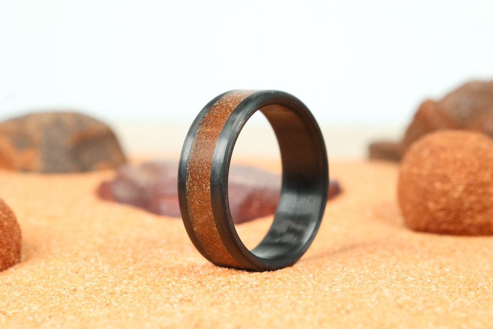 This carbon fiber band with Moab sand was born out of our passion for the desert of the Southwest, we've captured a small part of a great place so that you can carry it around with you as you go about your adventuring ways. Rings in our Nature Collection combine a durable high strength epoxy resin system with elements from nature to encapsulate more than just the physical elements. Wearing this is just one small way we enjoy and pay homage to the desert we love so much.