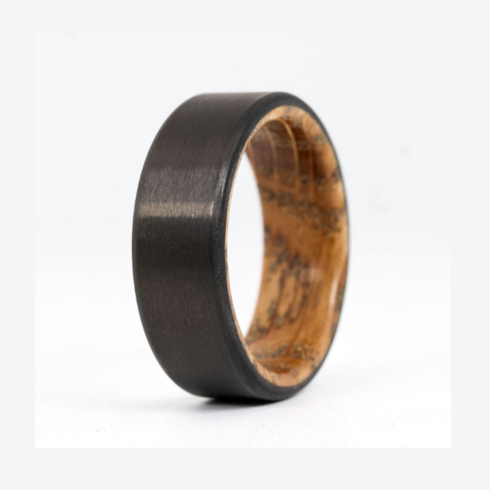 The Cooper whiskey barrel wedding ring with carbon fiber exterior flips the script with a smooth interior made from retired white oak barrels sourced from High West distillery. Its protective outer shell is crafted from one of our signature carbon fiber styles, The Bullet.