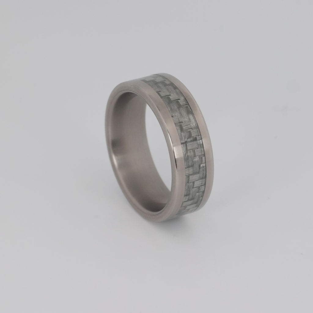 Demand what you want and get what you like. The Falcon ring exudes bright dominance by way of silver coated glass fiber woven in a 2x2 twill pattern making it appear like carbon fiber. Much like our carbon fiber ring styles, we decided to build this ring utilizing titanium as a base for its high strength and light weight elemental properties.