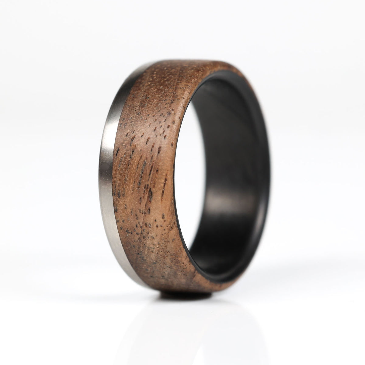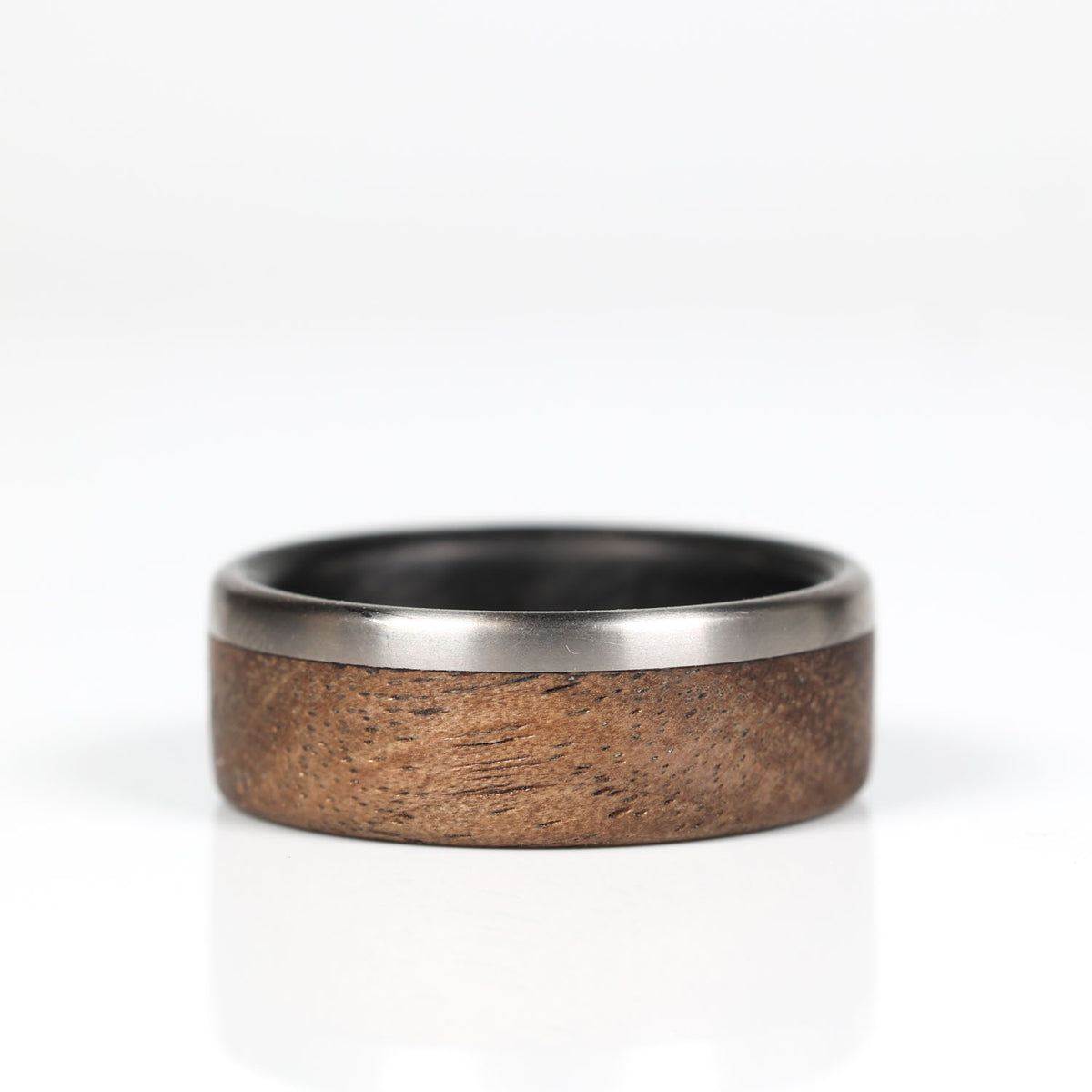 Ride the rails with style by sporting this walnut ring with titanium and carbon fiber. Walnut wood perfectly accents a strong titanium for a look as timeless as the railroad itself.