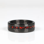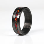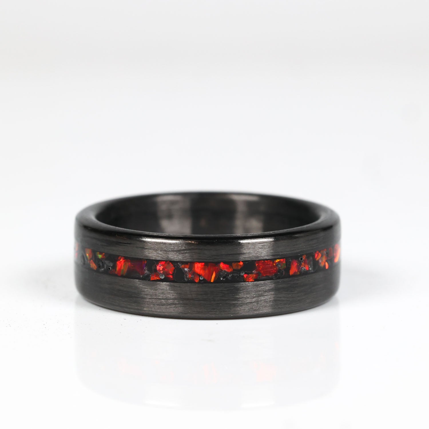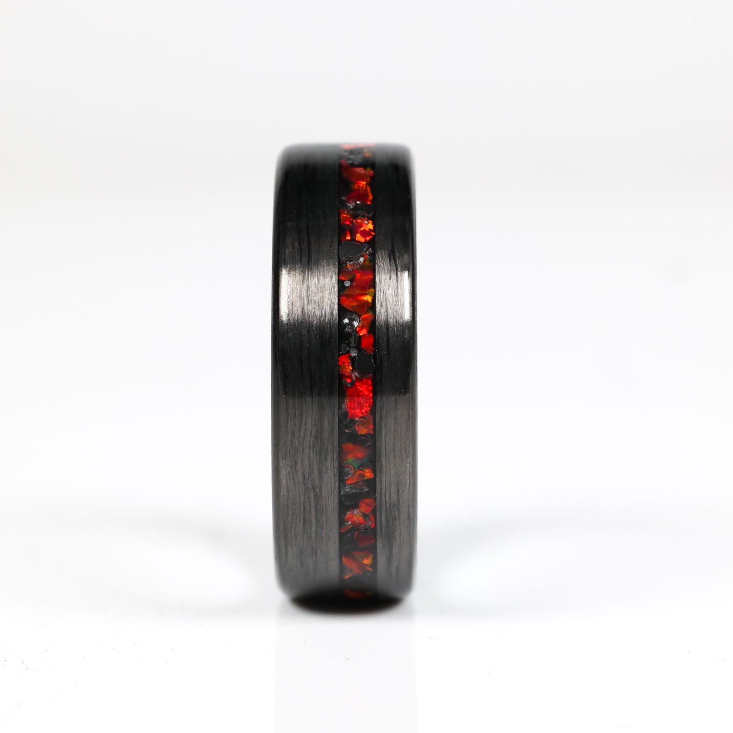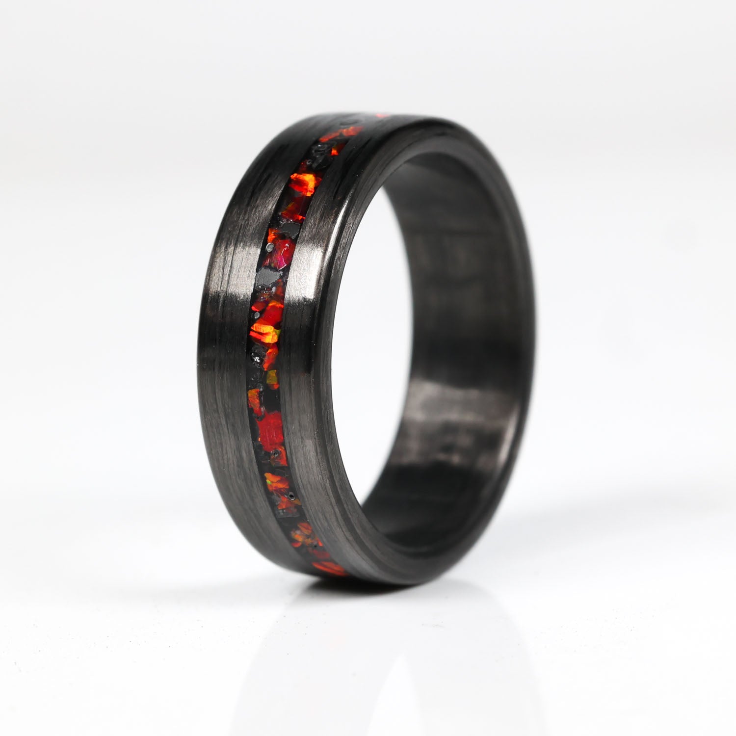 Carbon fiber meets a fiery blend of red crushed opal and black obsidian. It's like wearing a volcano on your finger, but without the burns. Perfect for those who want to make a statement or just distract from awkward handshakes. Ignite your style and let your fingers do the dazzling!