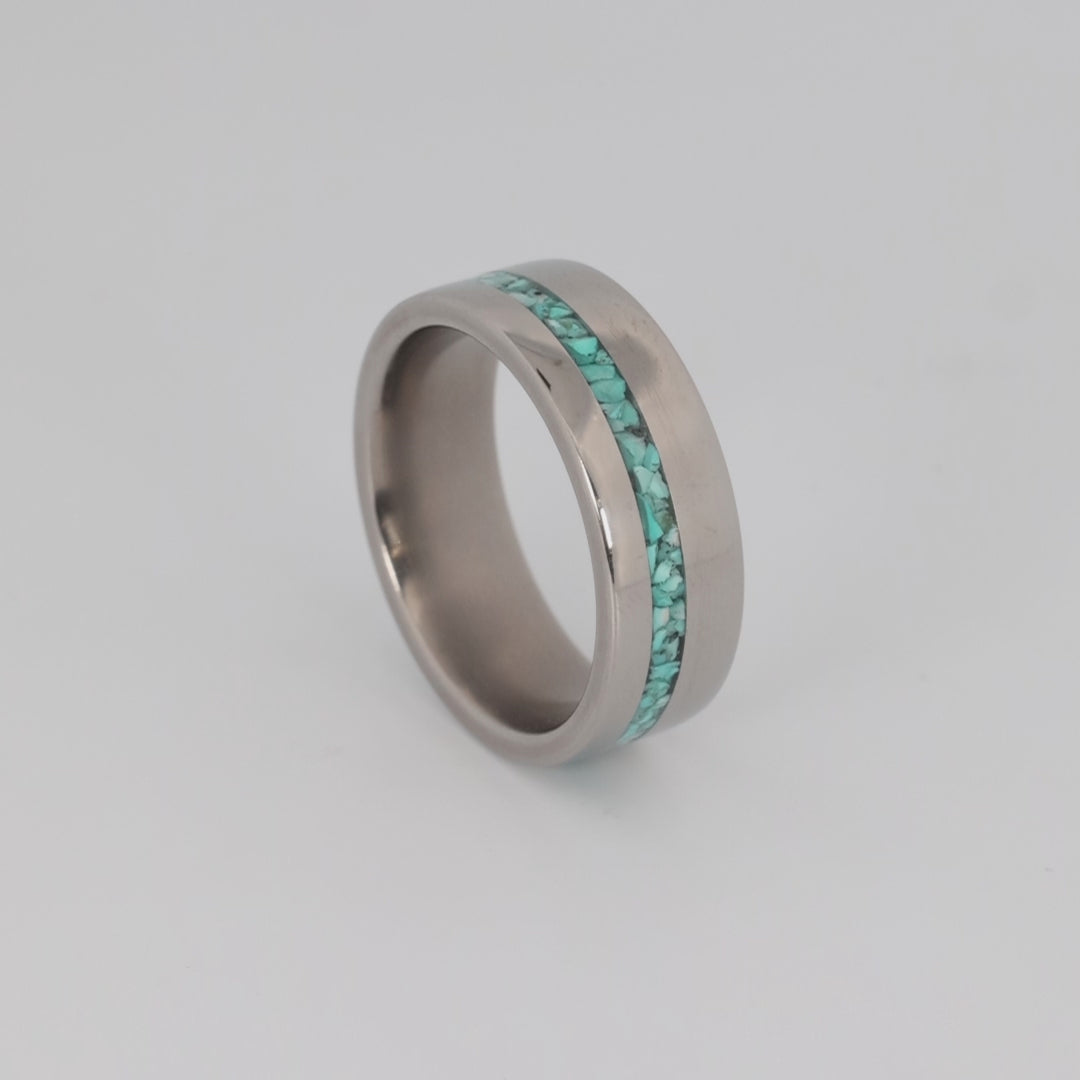 A crushed turquoise ring with titanium. Beautiful and culture defining, these hand crushed and placed stones adorn your finger with their rich history and captivating hue.