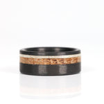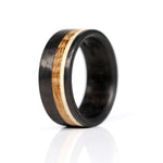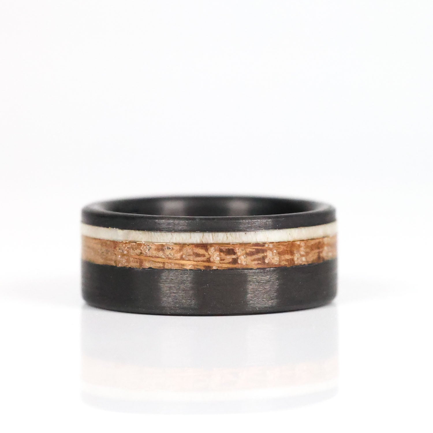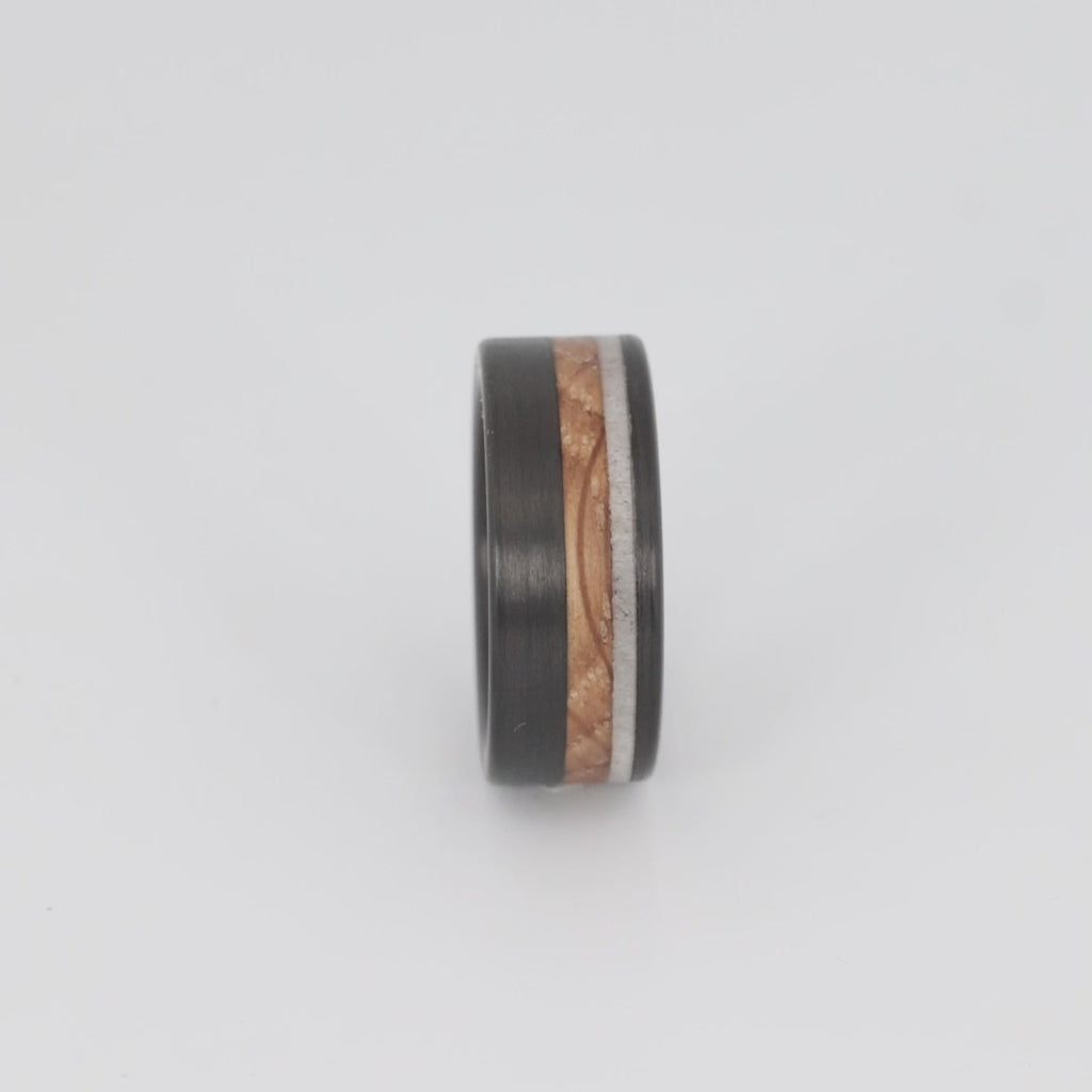 This ring slices through the air like a well aimed shot, straight down the gullet. This ring is constructed of a carbon fiber base with thinly sliced natural shed deer antler and a matching slice of whiskey barrel wood. These materials are offset placed between a firm and durable exterior of carbon fiber.