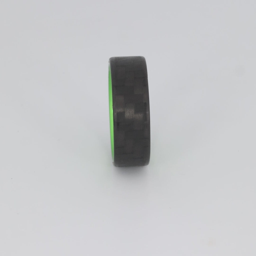 Introducing "The Green Grand Prix" - A green aluminum colored ring that captures the essence of high-speed racing. Made from carbon fiber and colored aluminum, this ring features a vibrant green hue that embodies the speed and energy of the racetrack.