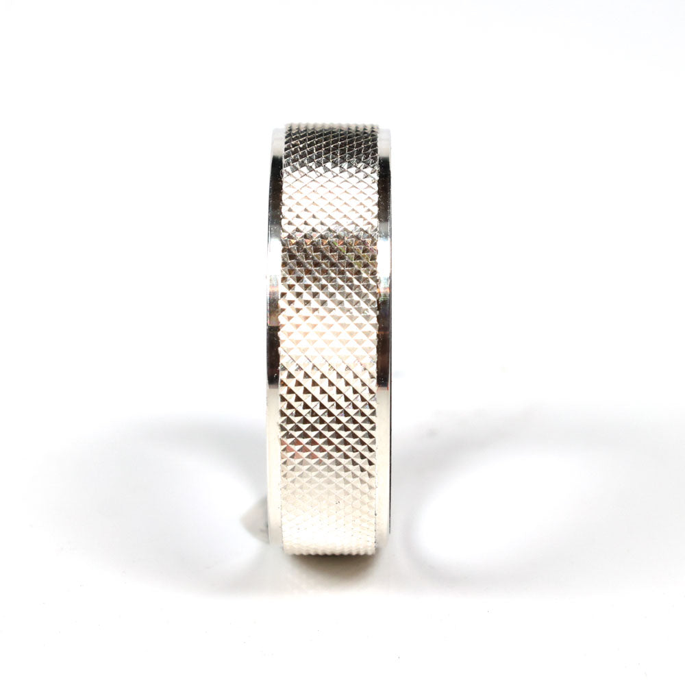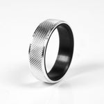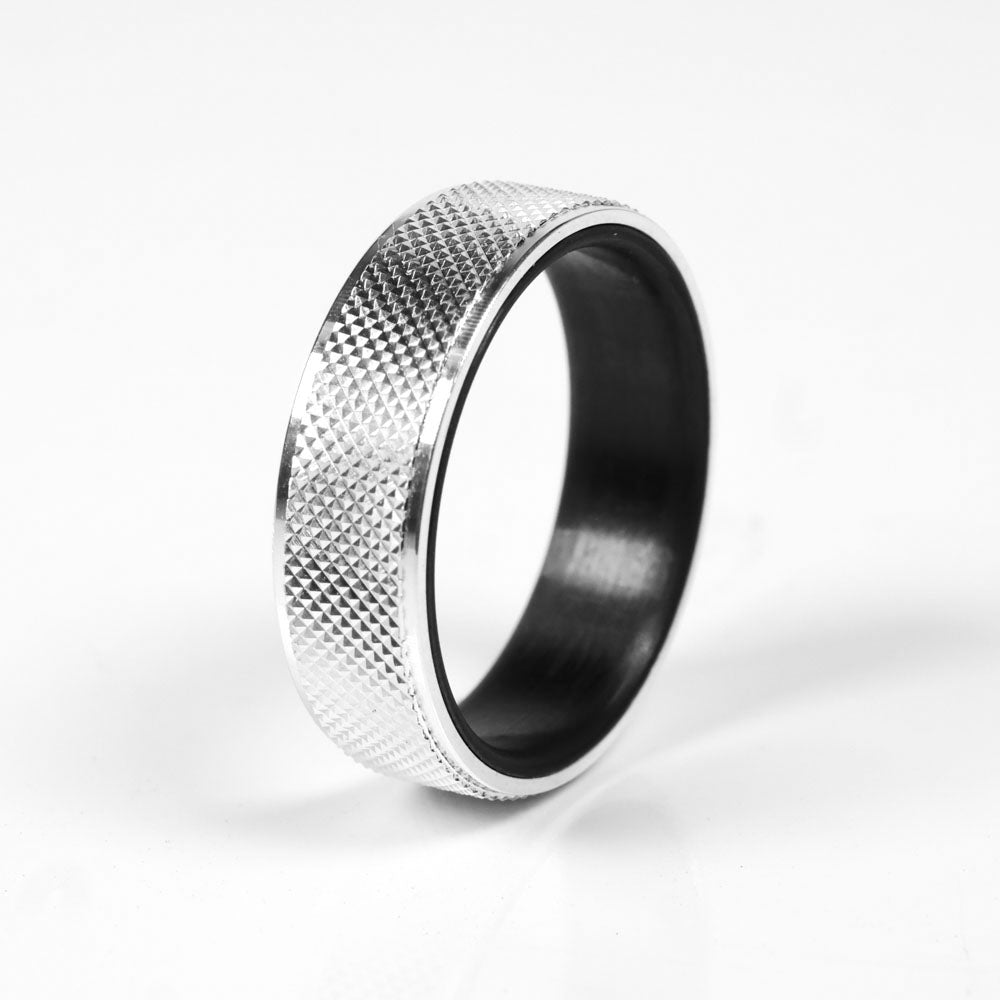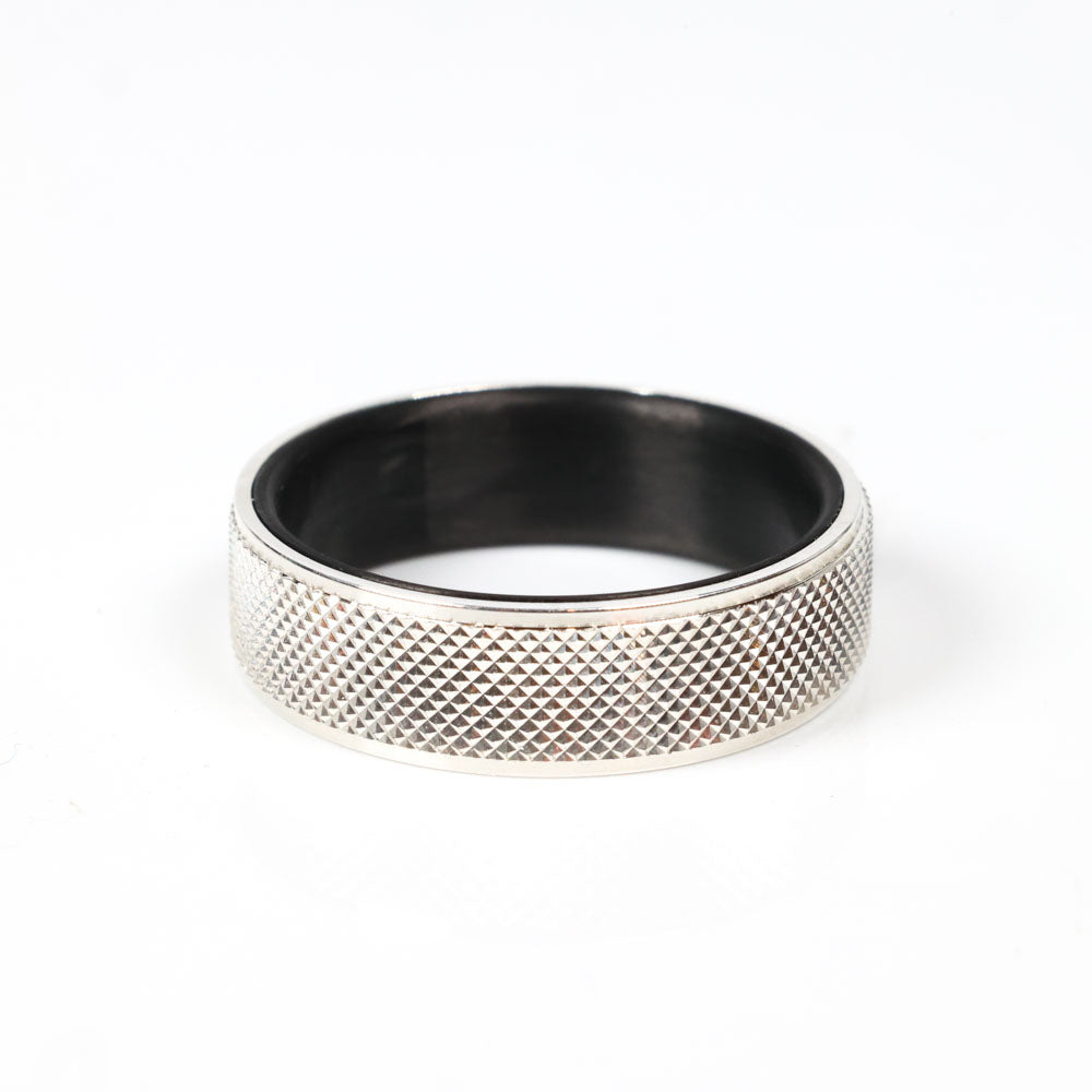 The Chancellor ring exudes quiet power and refined control. Its knurled silver exterior mirrors the precision of leadership, while the carbon fiber liner anchors it with unyielding strength. Built for the man who leads with intellect and integrity, this ring is both a symbol of command and a testament to composure under pressure.