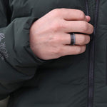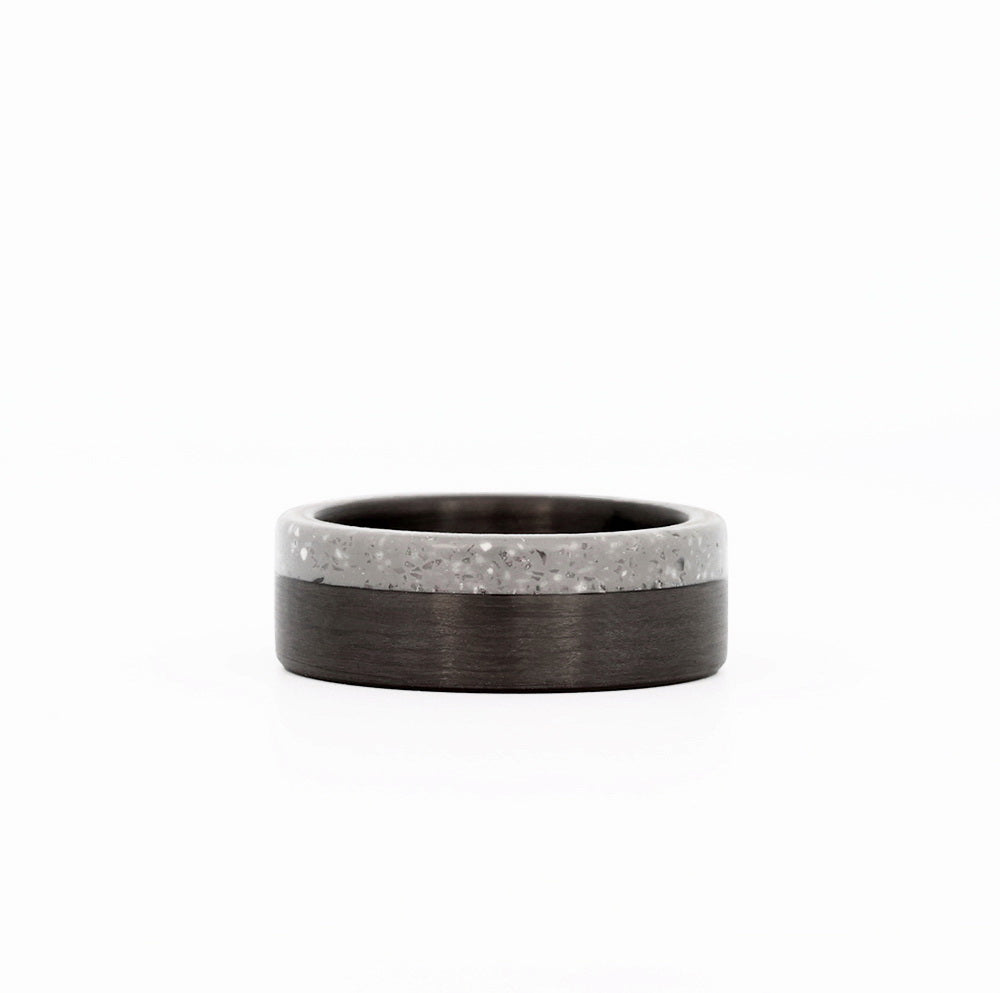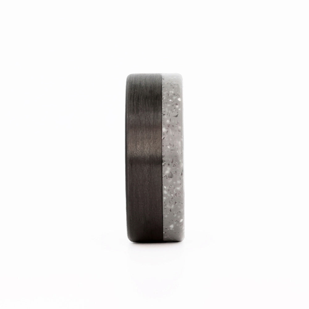 This men's concrete ring with carbon fiber blends the past with the future. Like its namesake city, this ring favors the modern future rather than the past.