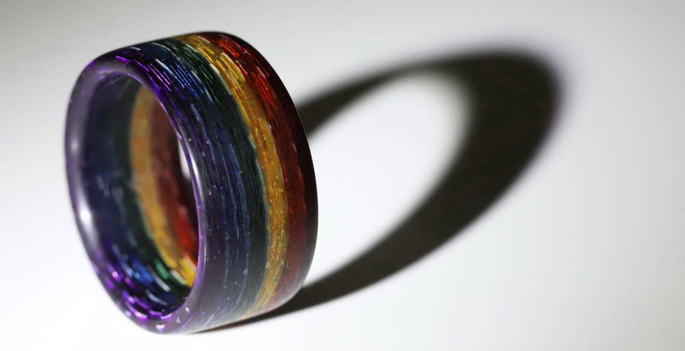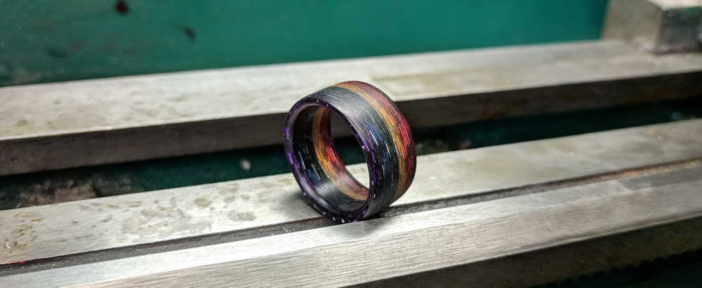 We've discovered a few of these classics in our inventory and are hoping they find a great new home on your finger! This style was the first of Element Ring Co's entry into stacking rainbow colored composite layers to form one cohesive and uniquely presented rainbow.