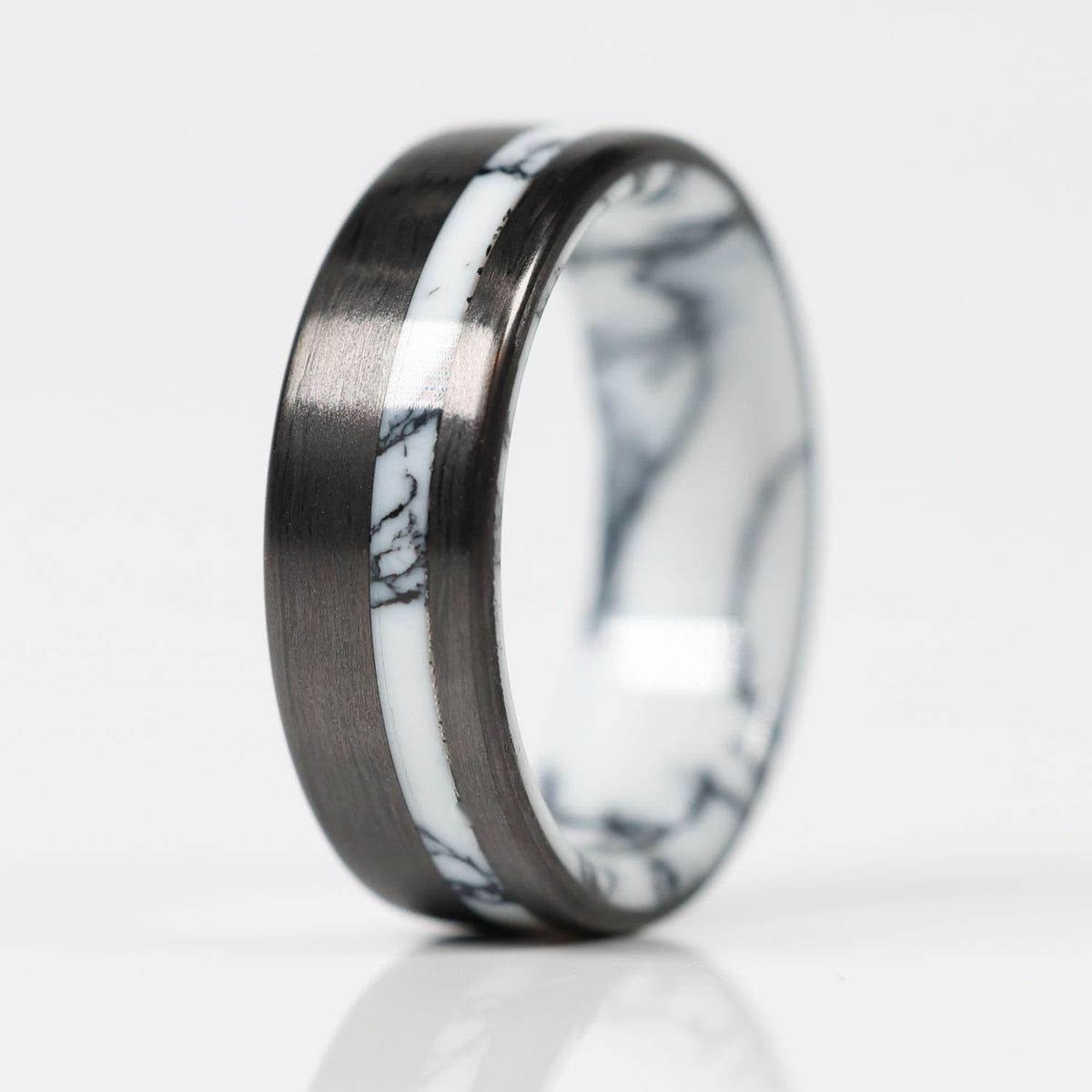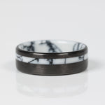 This ring features a black-and-white swirled TruStone marble interior and offset stripe, like the ashes of fallen kingdoms and the dreams of your enemies—beautiful, chaotic, and undeniably regal. Wrapped in a sleek carbon fiber exterior, it's as tough as your ambition and twice as good-looking.