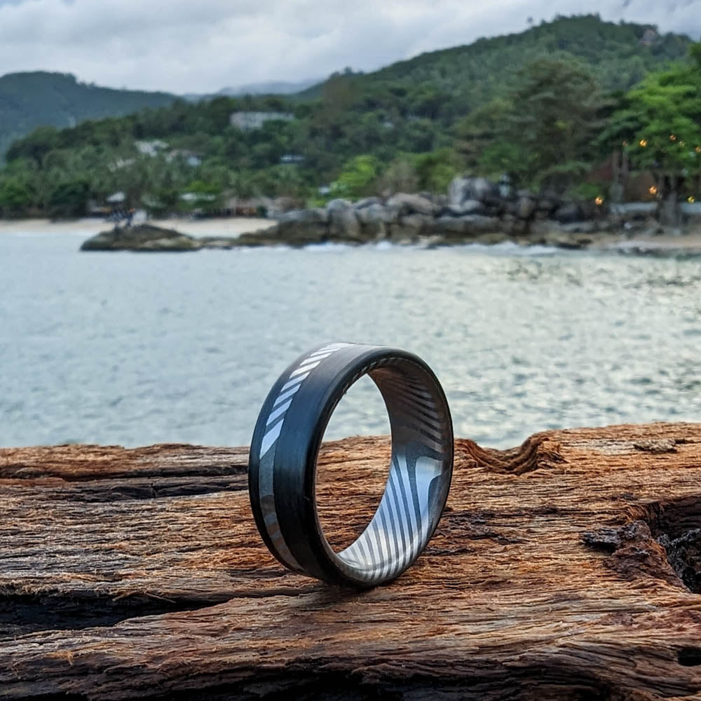 Damascus Men's Wedding Ring with Carbon Fiber Interior