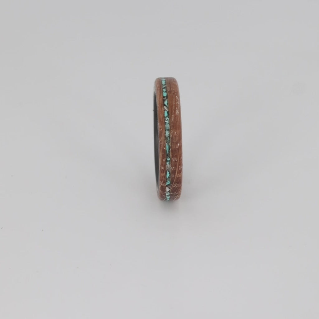 The Cowgirl is a 4mm women's turquoise wedding band made to match your down to earth sensibility. Crushed turquoise accents real High West whiskey barrel wood for a look that perfectly matches those blue jeans and leather vest. Carbon fiber finishes off the look with a sleek black.