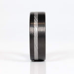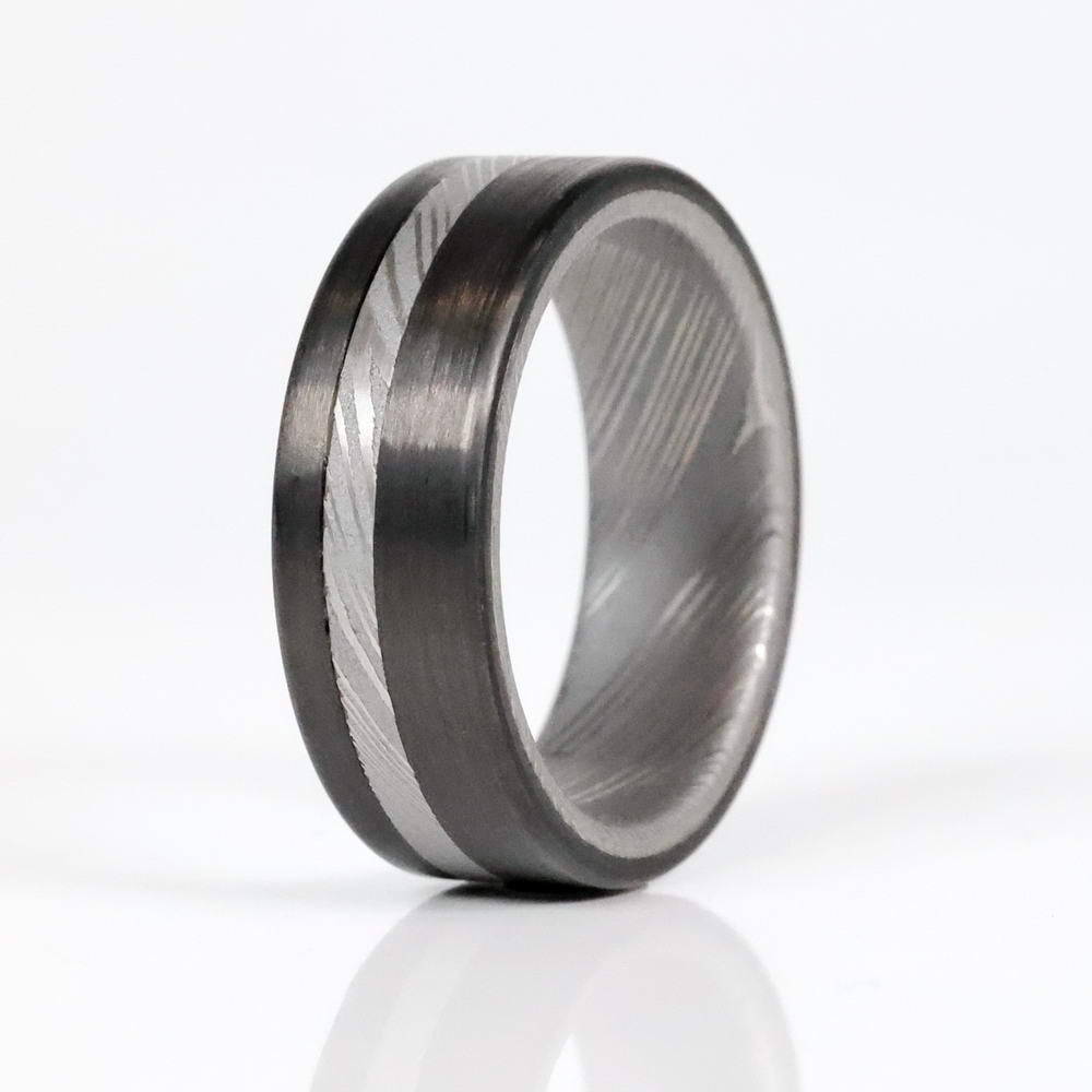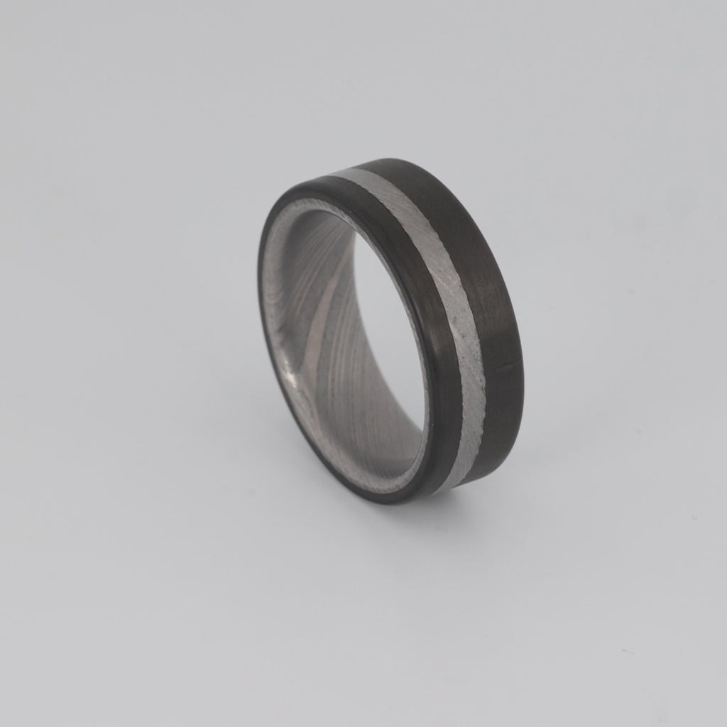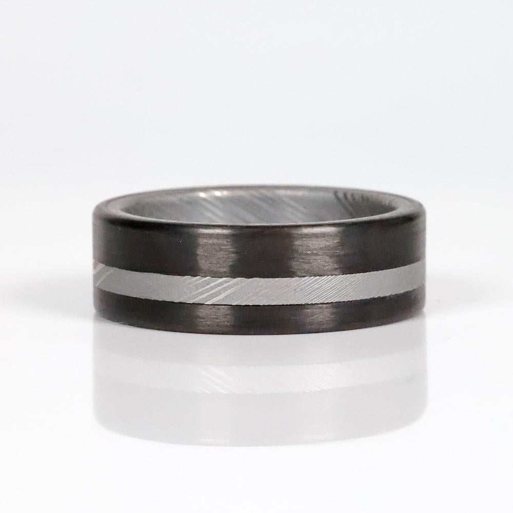 Carbon Fiber and Damascus Steel come together to form a modern version of the phalanx. This damascus steel men's ring with carbon fiber will be there to protect you from whatever comes your way, whether it be a home invasion, your neighbor's yappy dog, or your wife asking you to take the trash out for the 11th time, The Spartan will be your guardian.