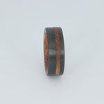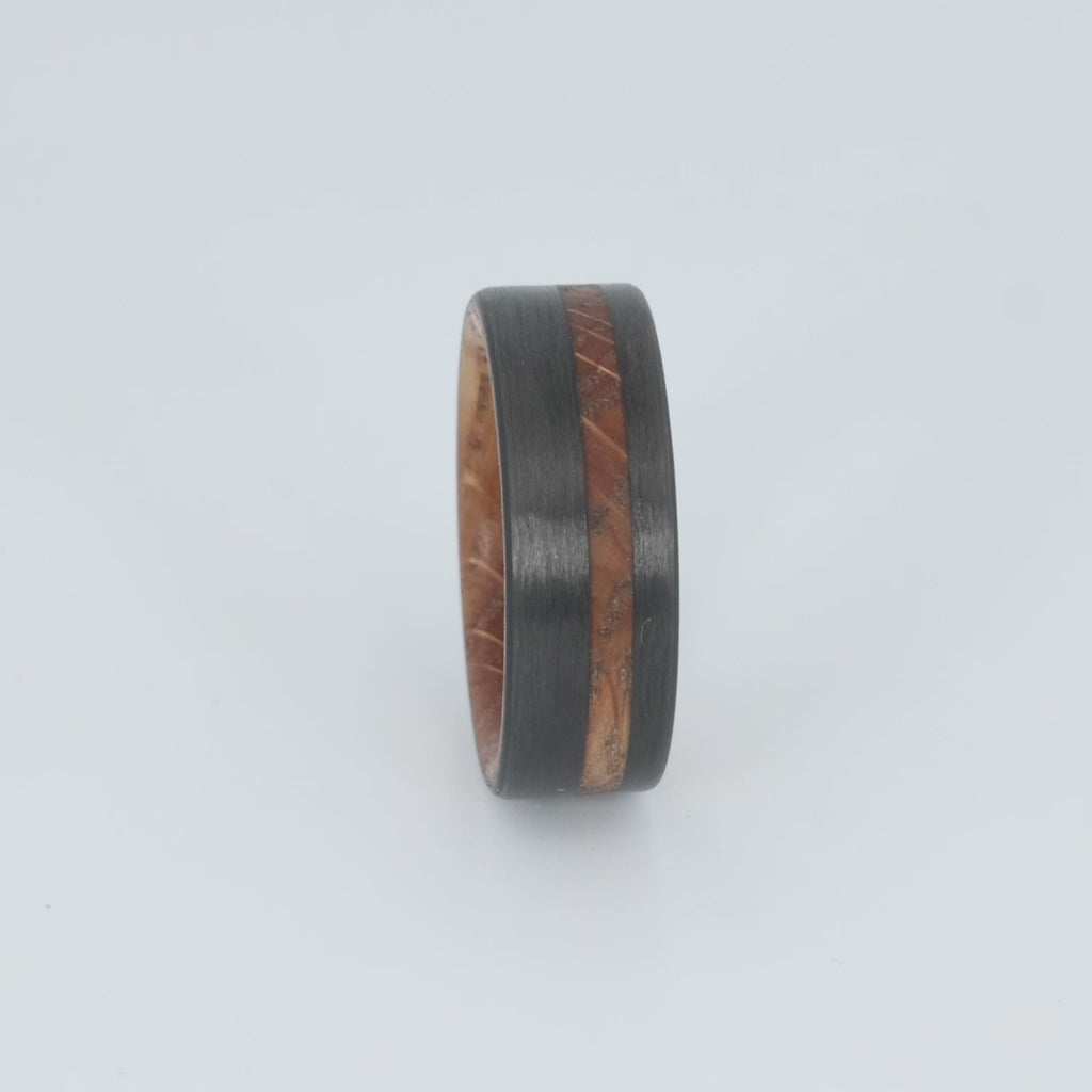 This men's whiskey barrel band with carbon fiber shows you're the man in charge, the one who can corral anything and anyone, the one who drives the flock. Handmade from High West Distillery Whiskey Barrel wood and pure aerospace carbon fiber this ring is bound to gather a crowd.