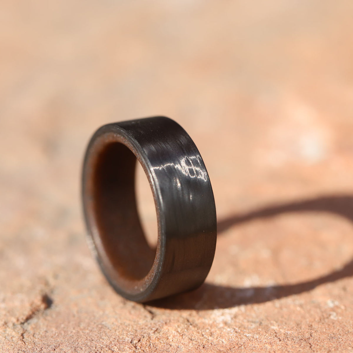 This carbon fiber band with Moab sand Interior was born out of our passion for the desert of the Southwest, we've captured a small part of a great place so that you can carry it around with you as you go about your adventuring ways. Rings in our Nature Collection combine a durable high strength epoxy resin system with elements from nature to encapsulate more than just the physical elements. Wearing this is just one small way we enjoy and pay homage to the desert we love so much.