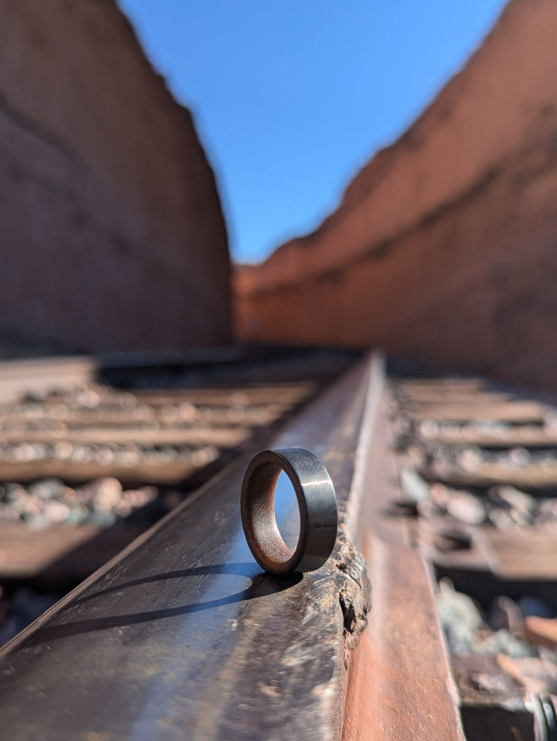 We make this ring by casting directly to the inside of our Bullet Ultralight carbon fiber ring. The red rock sand collected comes from Moab, Utah and is filtered through numerous sieves. We hand finish every single facet and edge of each ring to ensure comfort and fit.