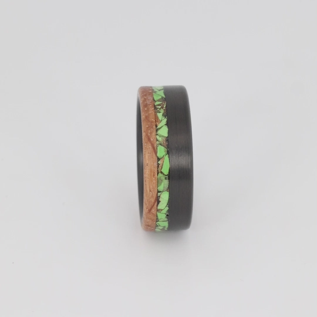 The Mojave carbon fiber ring is a perfect collision of green turquoise, carbon fiber and whiskey barrel wood from High West distillery. Whether an LA day tripper or a member of the indigenous Mojave people (perhaps both) you will feel right at home with this ring fitted nicely on hand.