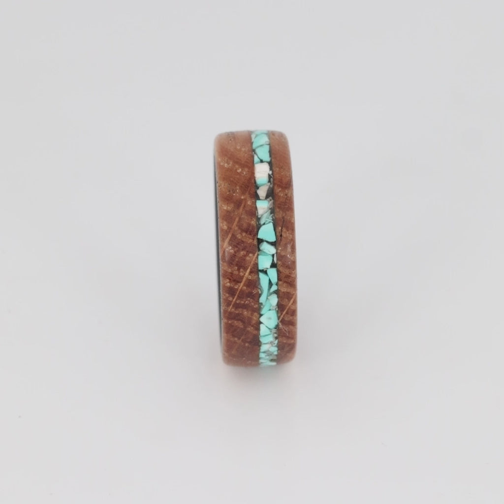 The Cowboy is our turquoise inlay ring with whiskey barrel wood and a carbon fiber interior. It carries an old school western feel all while providing a solid foundation only afforded by a carbon fiber core. A classic not to be one upped. Its exterior is a beautiful ode to the past but inside, the Old Western is a sure call to the future.