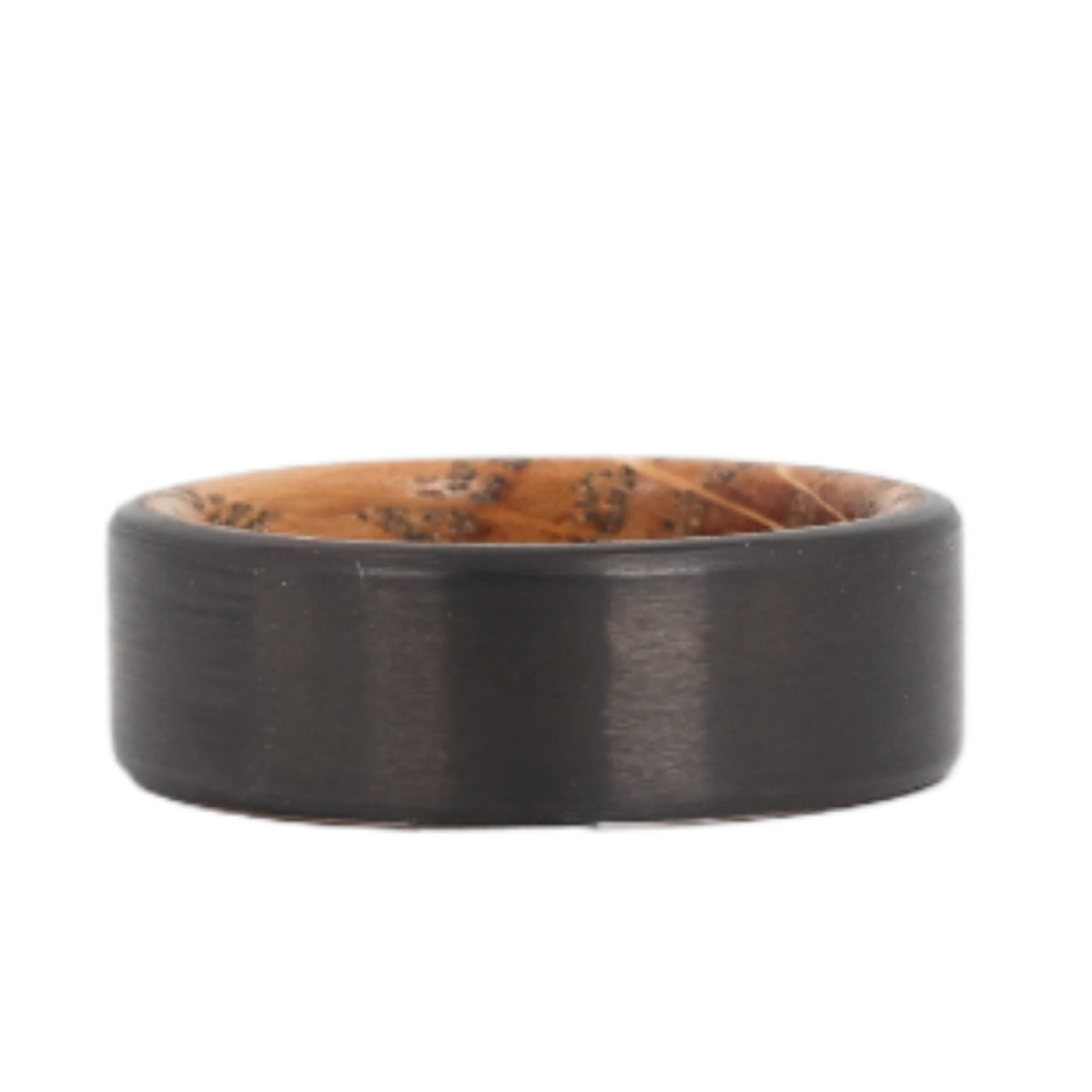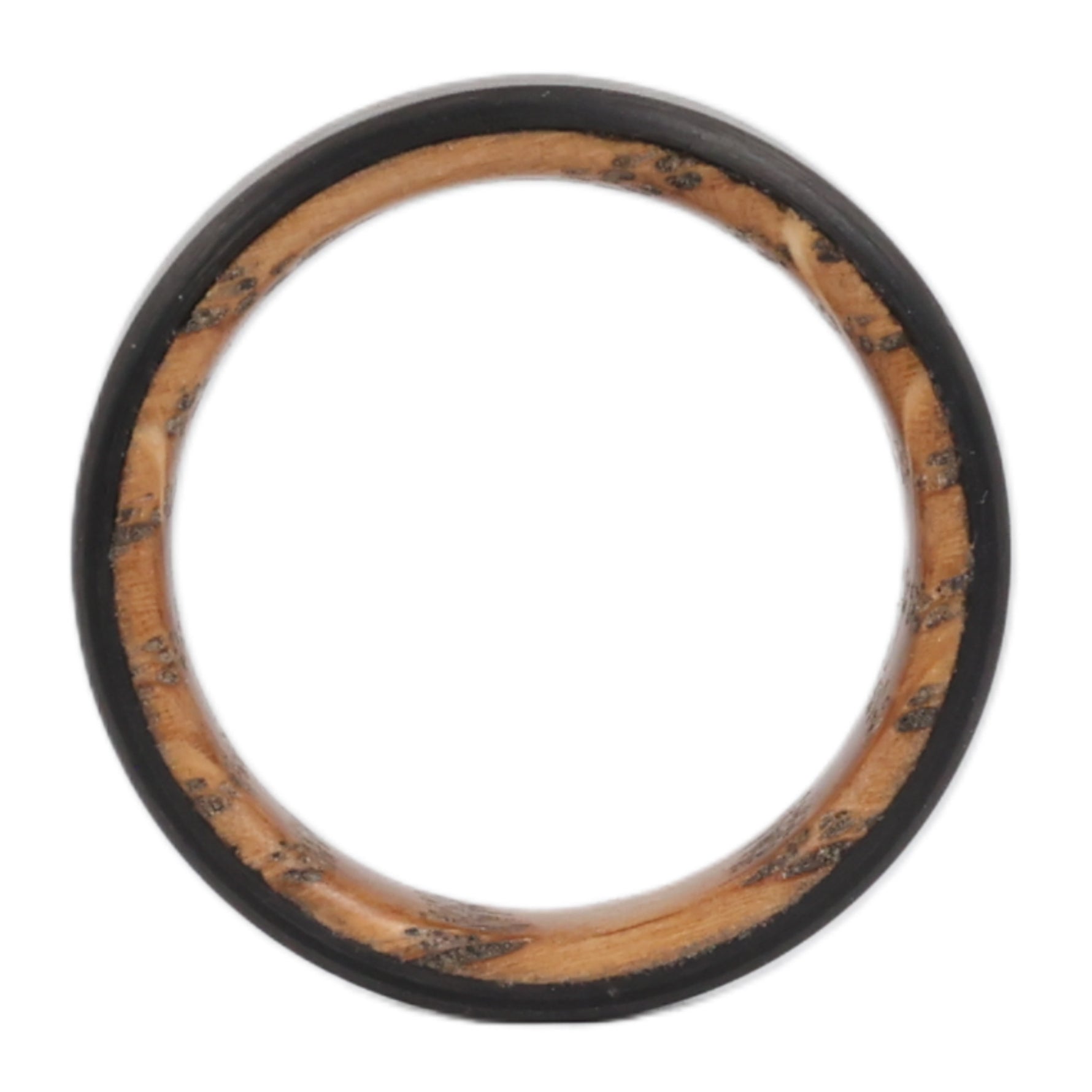 The Cooper whiskey barrel wedding ring with carbon fiber exterior flips the script with a smooth interior made from retired white oak barrels sourced from High West distillery. Its protective outer shell is crafted from one of our signature carbon fiber styles, The Bullet.