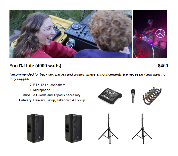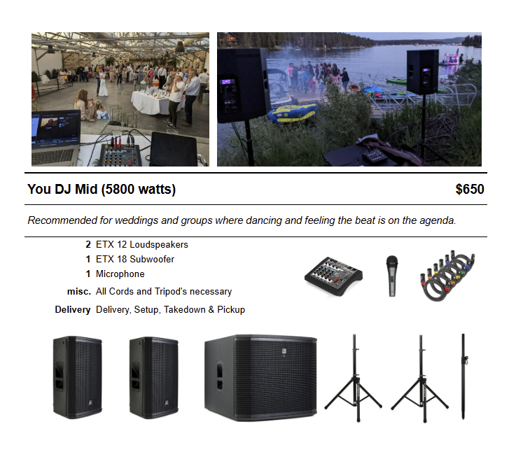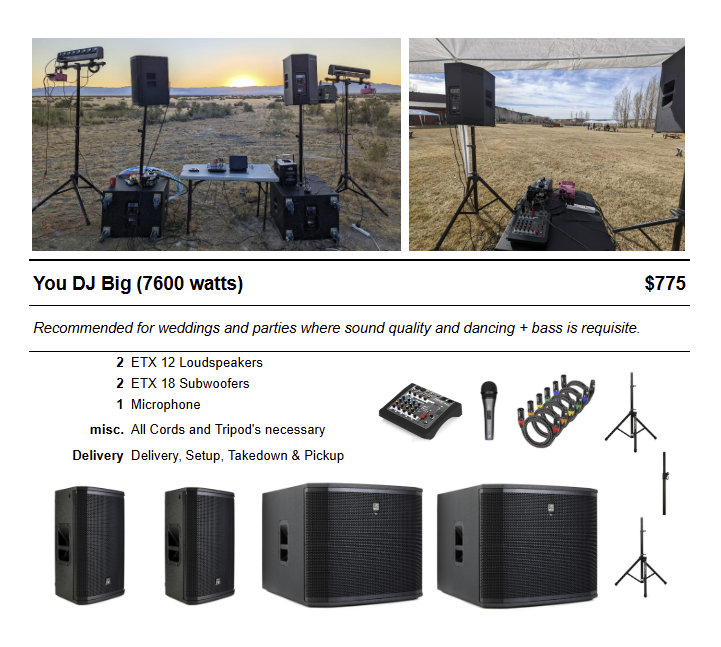 You have the playlist, just hook up your phone or computer and play your own wedding or dance party! We have top grade Electro Voice ETX powered speakers that will shake your windows and bones (if you choose). We deliver & setup, then after your event return + break down all equipment. We'll show you how to control volume, bass, microphone and more. Delivery is currently offered within the Salt Lake valley (included in the price) but please reach out for options beyond. Our equipment is currently set up in South Salt Lake City - Please reach out if you are interested and would like to listen. We also have RGB lasers and fog options to choose from for buy-up.