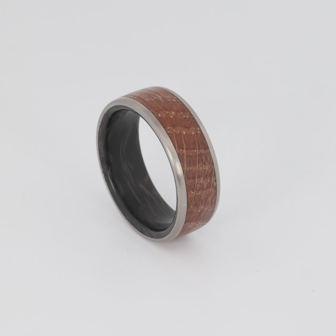 Belly up to the bar for a nice tall glass of mead at the Tavern while wearing this men's whiskey barrel wedding ring with titanium rails and forged carbon fiber sleeve. With it's retired whiskey barrel wood exterior, The Tavern will be your companion as you share your tales with weary travelers at the bar.