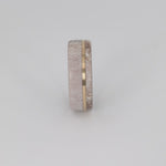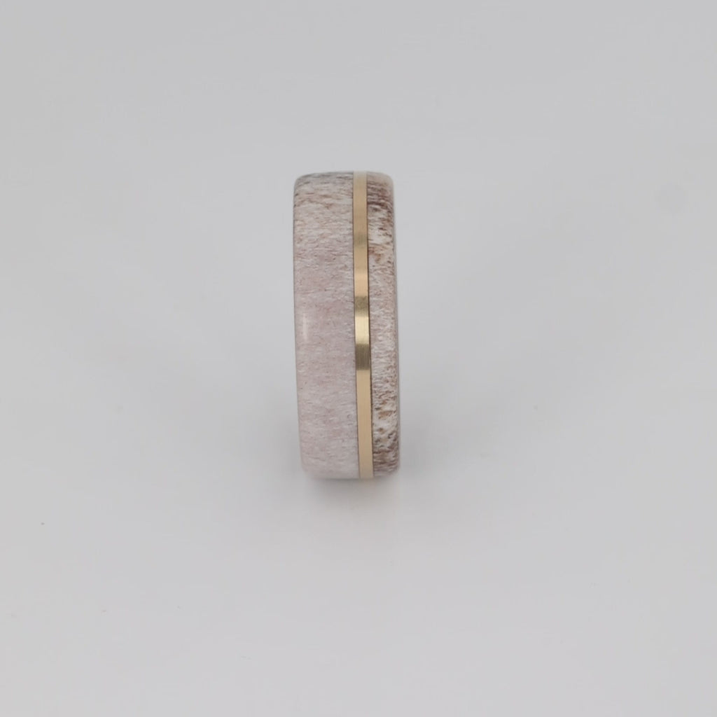 This antler wedding ring has a 14k gold inlay wrapped around a carbon fiber sleeve. All our rings are handcrafted in Salt Lake City, Utah.