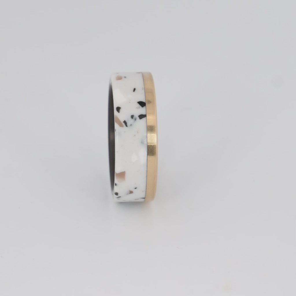 Immerse yourself in history and arts with this terrazzo wedding ring with 14k gold and a carbon fiber interior. We can't promise you'll turn into Leonardo da Vinci when you wear this ring, but maybe try sculpting something while wearing it and see what happens.