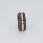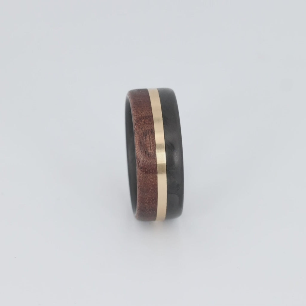 walnut wood and 14 karat rose gold wedding ring with carbon fiber sleeve