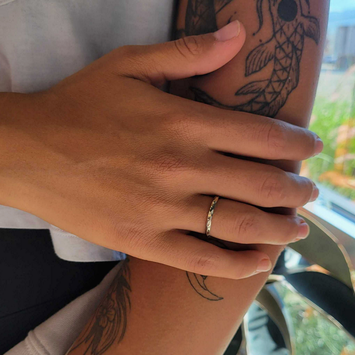 With the Athena, our stackable hammered white gold ring, you're at the top of the game, you're the one with the ideas that work. Strategically beautiful and inspiringly smart, you lead the room with the grace of a goddess.