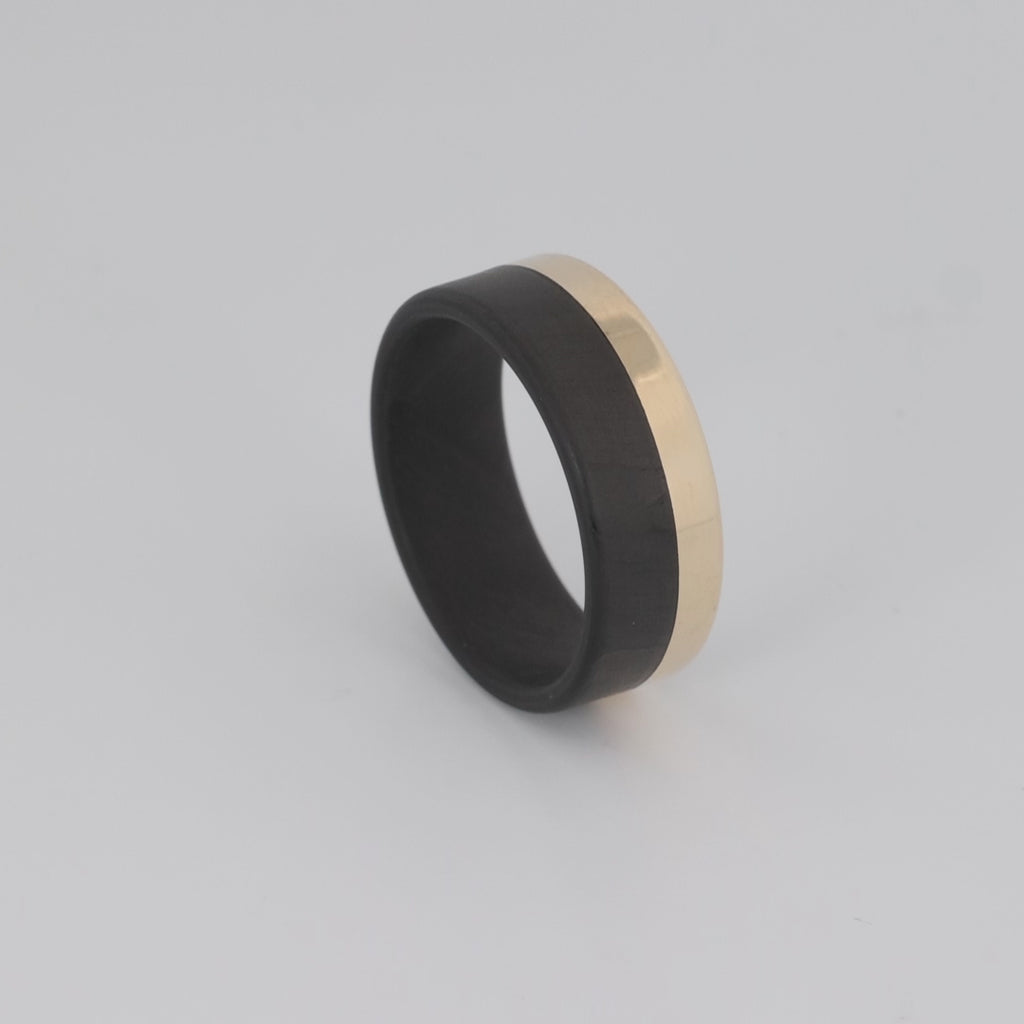 Be the Duke of your house. This 70/30 split men's carbon fiber ring with yellow gold strikes a delicate balance. The contrast of the jet black filament wound carbon fiber against the bright 14 karat yellow gold is a sight to behold.