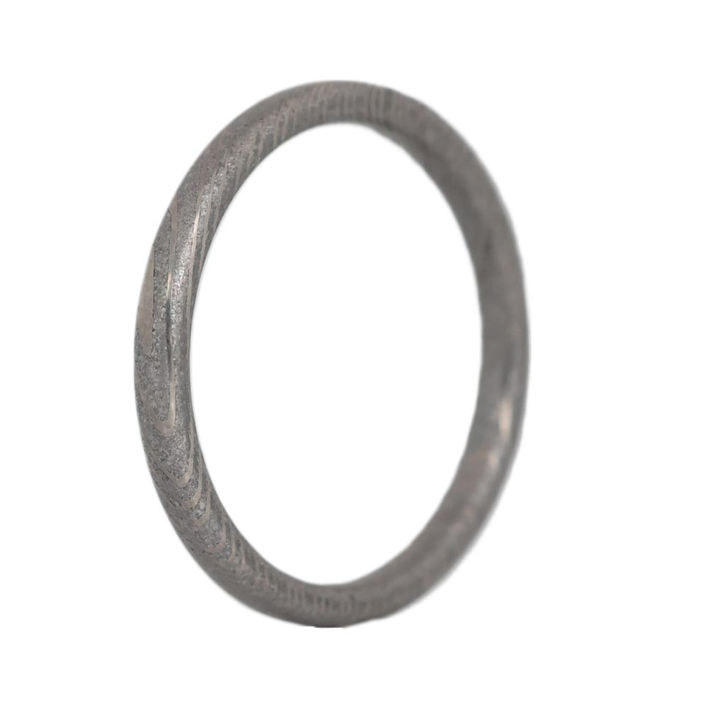Our Damascus stackable rings are handmade in Salt Lake City from forged stainless steel. They are 2 millimeters in width but can be customized if so desired.