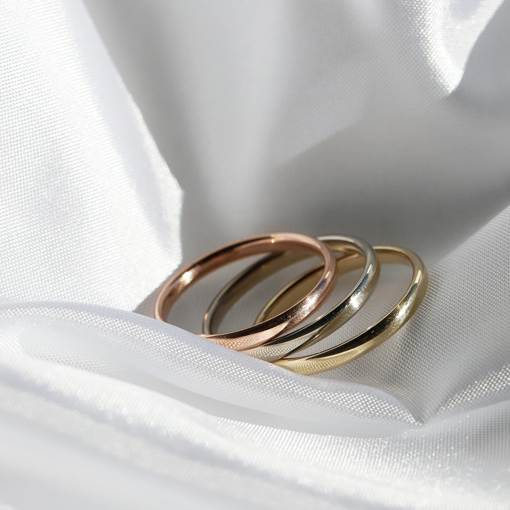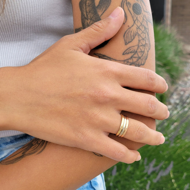 A gold stackable rings set made with 14k rose gold, 14k white gold, and 14k yellow gold. They say three is a crowd, but we say three is the perfect number to get a table at your favorite brunch spot on a crowded Sunday. You'll feel as bougie as you look while you pound those bottomless mimosas and stumble to your uber.