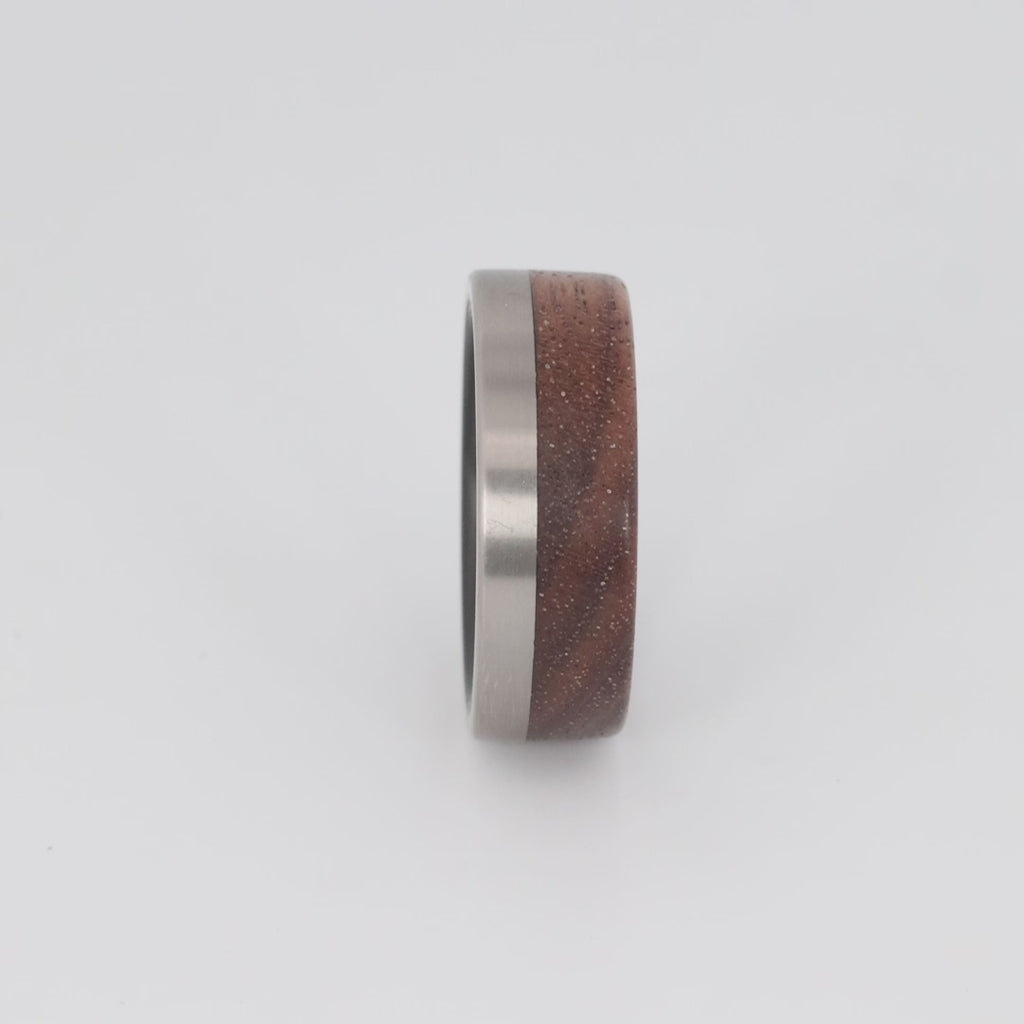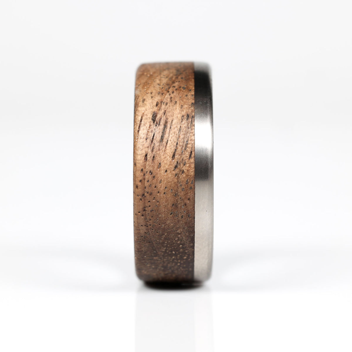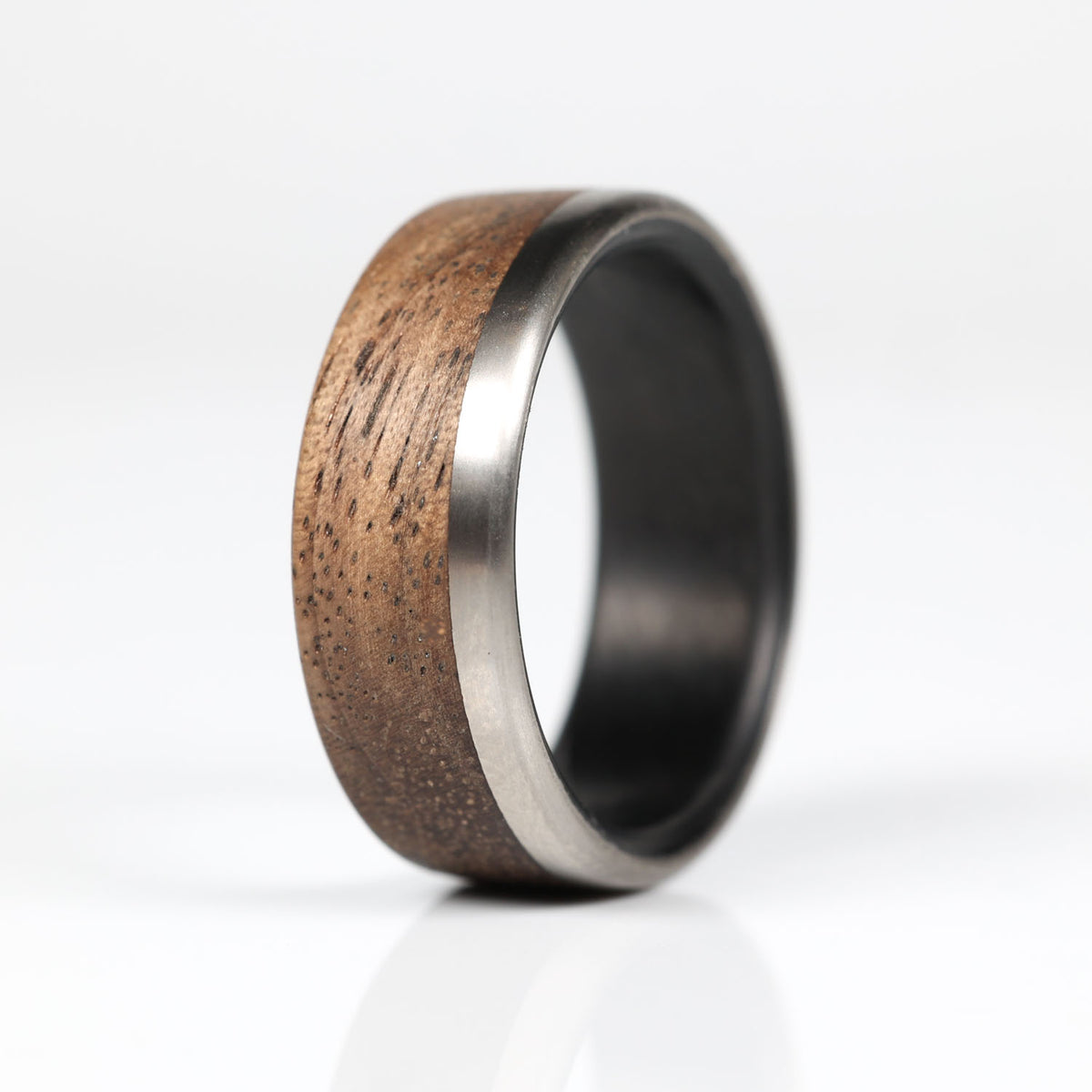 Ride the rails with style by sporting this walnut ring with titanium and carbon fiber. Walnut wood perfectly accents a strong titanium for a look as timeless as the railroad itself.