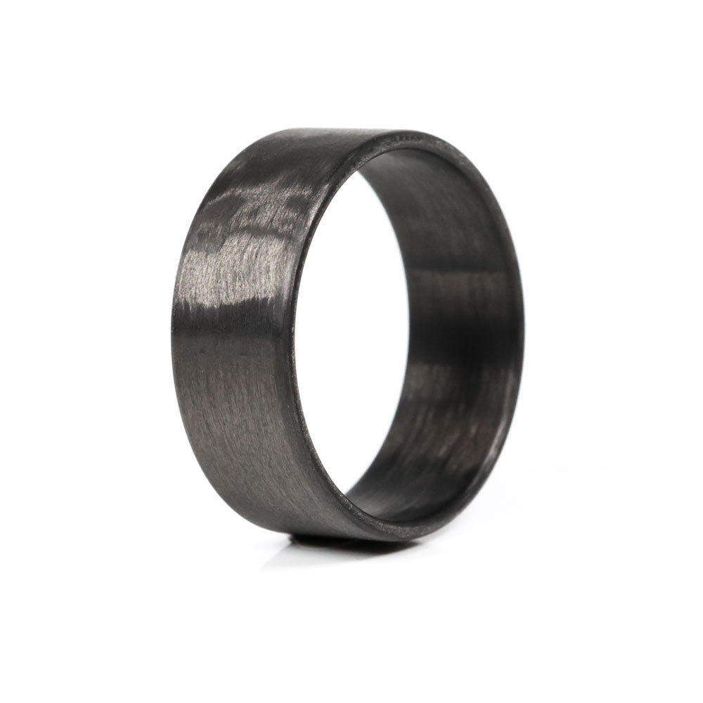The Sleek Ultralight carbon fiber men's wedding band rejects the twill of it’s woven brother's aesthetic and gets straight to business. With hand wrapped carbon fibers running the circumference of the ring, one can’t help but stare in awe at its simplicity.